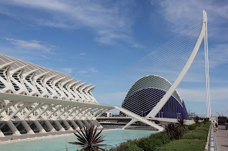 Valencia is Spain's city of science and technology, and at one end of the Turia park is the most extraordinary collection of buildings one's likely to see, appropriately called the City Of Arts And Sciences, and it's an absolute 'must see'. Designed by local architects Felix Candela and Santiago Calatrava (also responsible for the extraordinary Tenerife auditorium featured in a previous post), work commenced in the 1990s and, coming as no surprise, the six spectacularly futuristic buildings are still a work in progress dependent on funds being found to continue working. A tram route has been constructed that runs from the city centre - but it's also never operated for budgetary reasons! There's L'Hemispheric, a 3D panoramic cinema which looks like a giant human eye, its ovoid roof/screen is over 100 metres long and the 3D glasses have built in speakers programmed to your own language (they're fantastic);